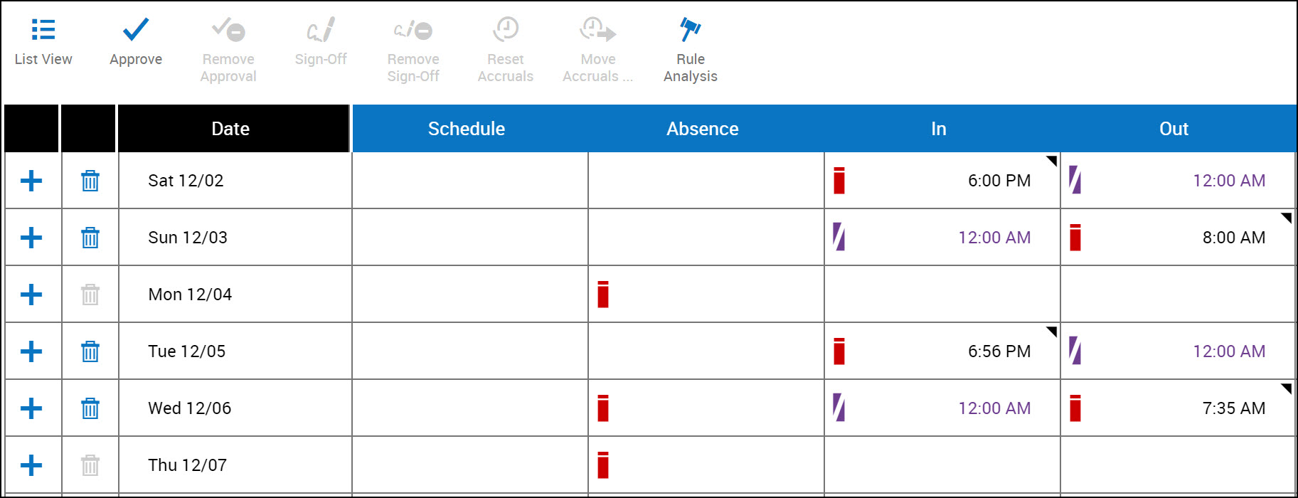 When a shift spans the midnight divide, the timecard indicates that a new day has started by displaying purple phantom punches at midnight to end one day and start another. This is also true if a non-midnight day divide is defined in the fixed rule. The totals and the Rules Analysis tool reflect the correct day divide, but the timecard displays phantom punches.